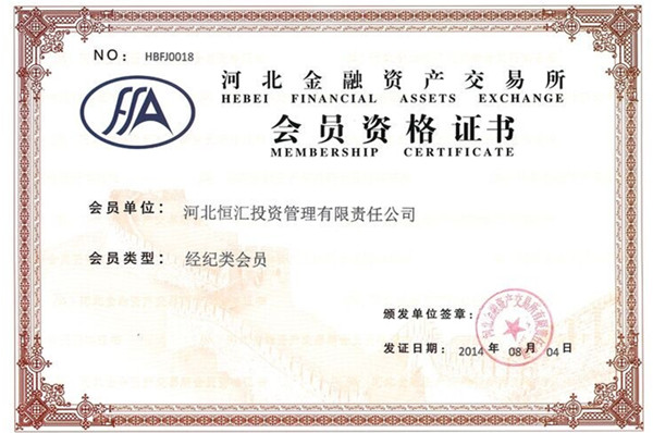 2014年8月,嘉聯(lián)集團(tuán)旗下河北恒匯投資管理有限責(zé)任公司獲得河北金融資產(chǎn)交易所頒發(fā)的《會員資格證書》,正式成為其經(jīng)紀(jì)類會員。